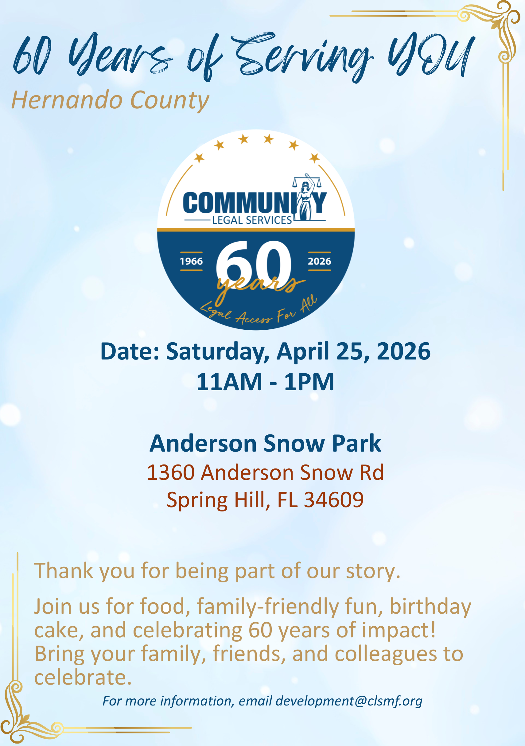 Our next anniversary event will take place in Hernando County, and we would love to see members of the Hernando community there. Whether you have been involved with Community Legal Services for decades or are just getting to know us, we hope you will join us.