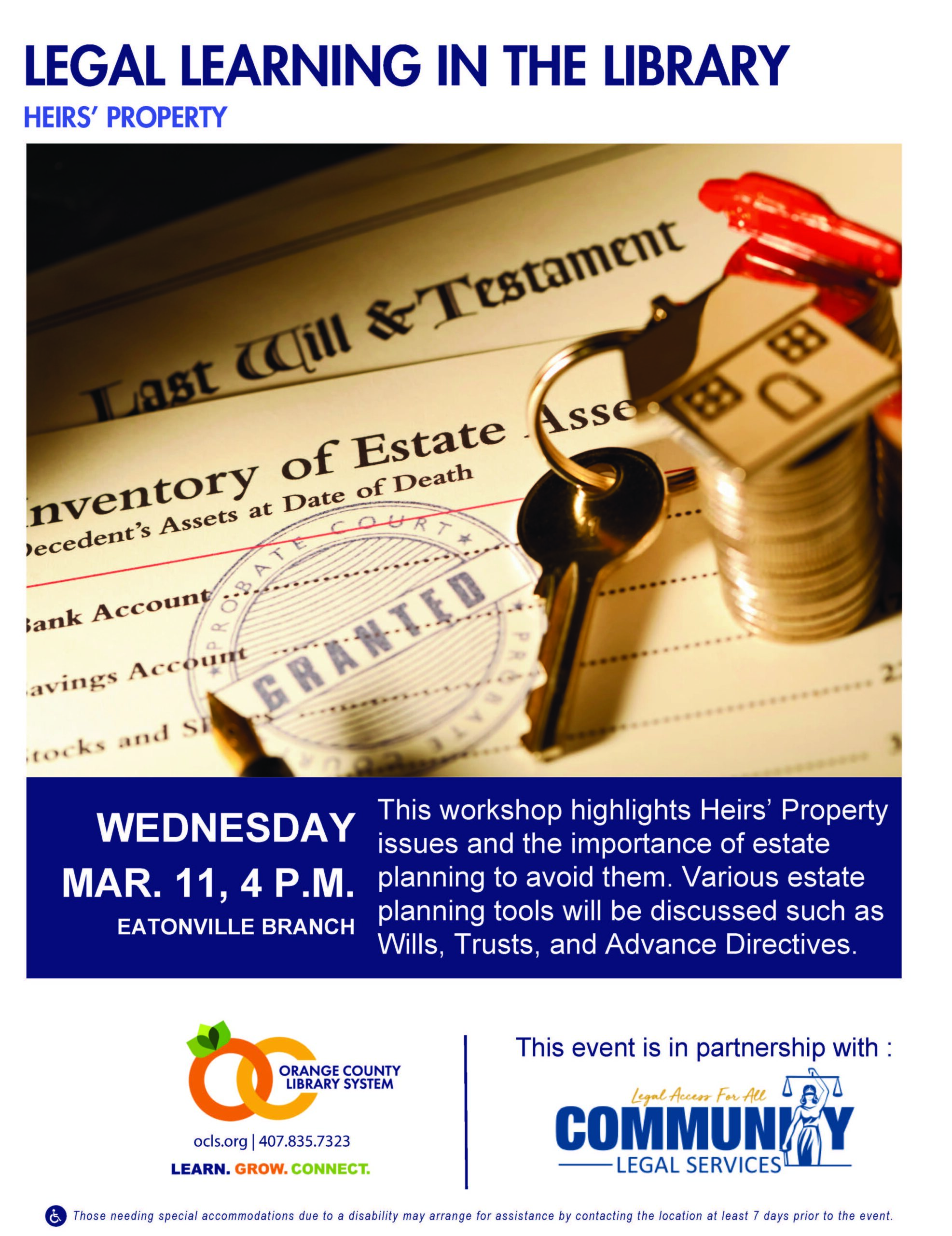 Join us for a Legal Learning in the Library Workshop! This workshop highlights Heirs’ Property issues and the importance of estate planning to avoid them. Various estate planning tools will be discussed such as Wills, Trusts, and Advance Directives.