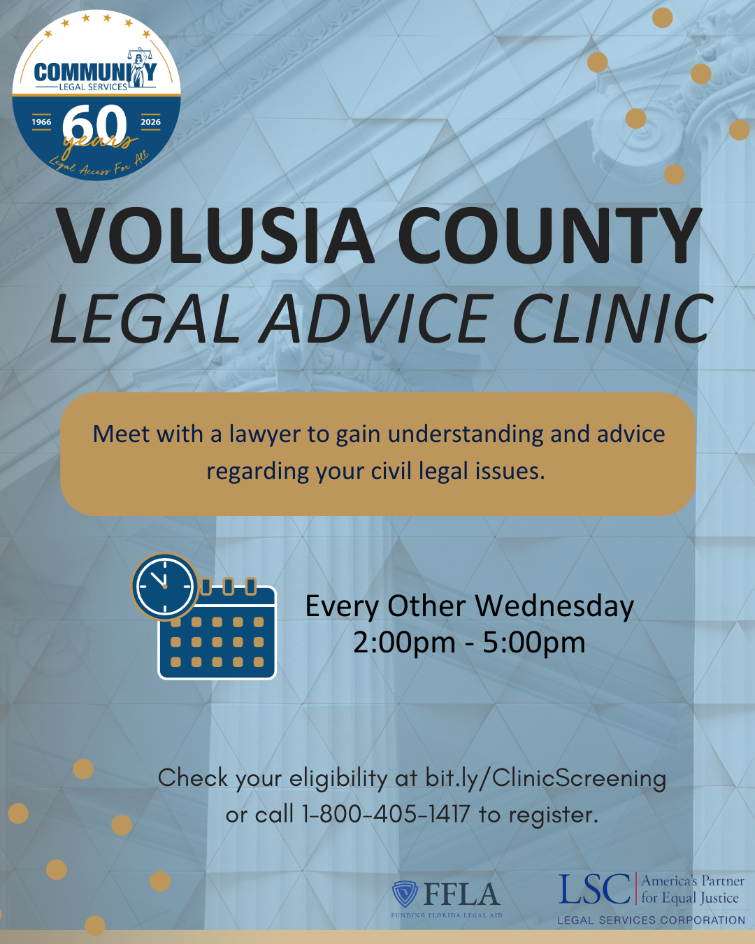 To participate, you must complete an eligibility screening and someone from our staff will contact you with more information and assist you with scheduling. The enrollment and qualifications process may take up to a week. If you have an immediate deadline, you may call our HELPLine and tell them which legal clinic you want to attend.